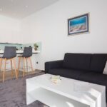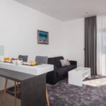 Spavaća soba s King Size krevetom, jedna kupaonica s toaletom i tuš kabinom. Uključena kuhinja, prostor za blagovanje, te dnevni boravak s kaučem na razvlačenje, klima uređajem, balkonom i ležaljkama za sunčanje.