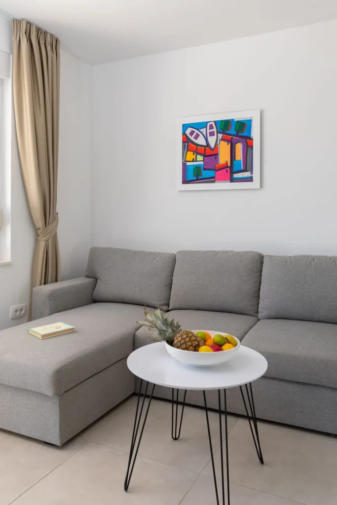 Dieses klimatisierte Apartment mit separatem Eingang verfügt über ein Wohnzimmer, zwei separate Schlafzimmer und ein Badezimmer mit Dusche und Haartrockner. Die Küchenzeile ist mit Herd, Kühlschrank, Geschirrspüler und Wasserkocher ausgestattet. Vom Balkon mit Meerblick bietet das Apartment außerdem eine Waschmaschine und einen Flachbildfernseher. Es verfügt über drei Betten.