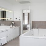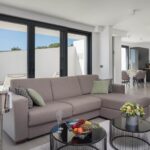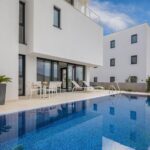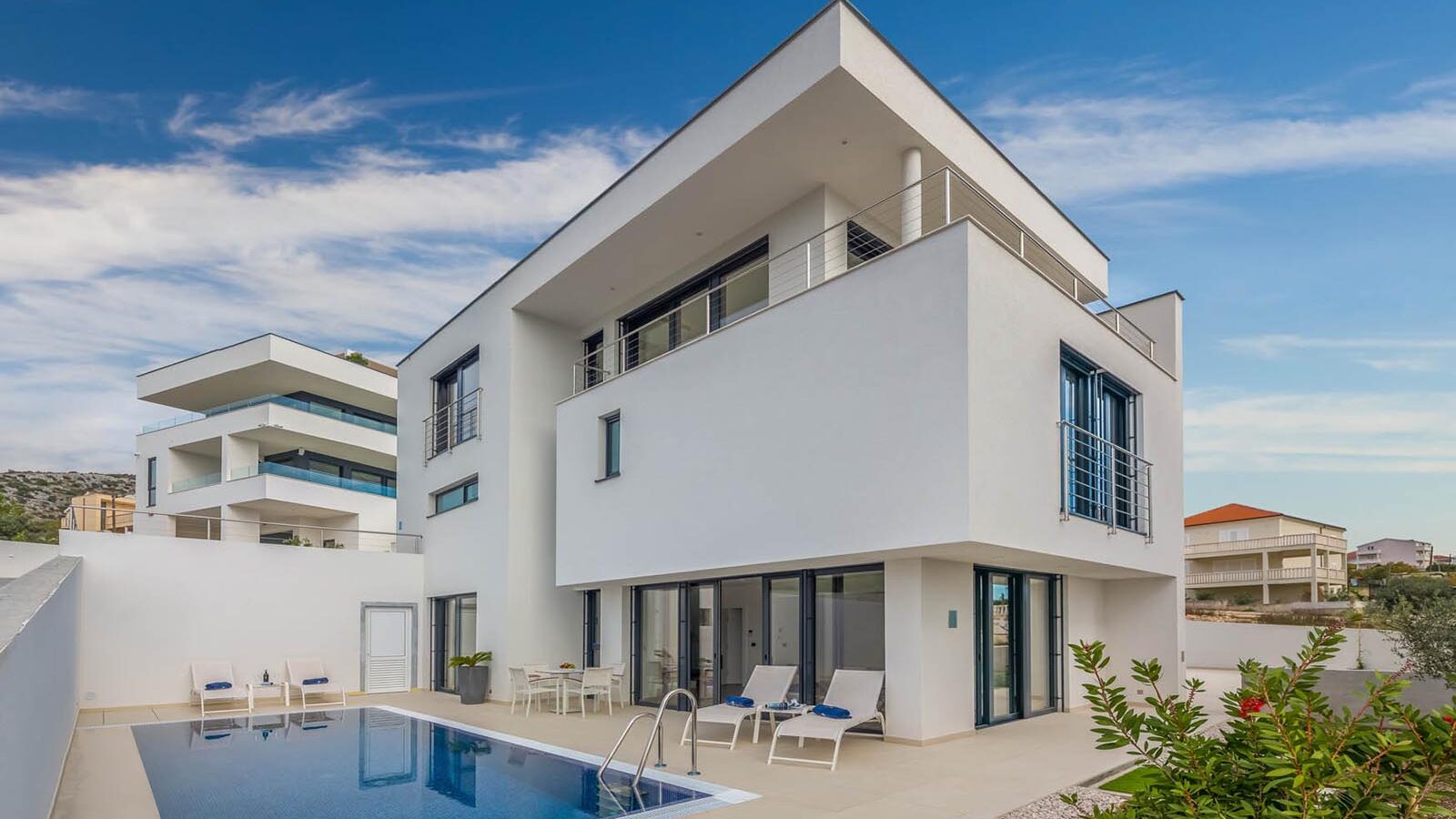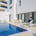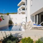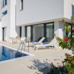 Villa mit 3 Schlafzimmern, einem King-Size-Bett, 3 Badezimmern, einer Küche, einem Esszimmer, einem Balkon, einer Terrasse mit Liegestühlen und einem privaten Pool.